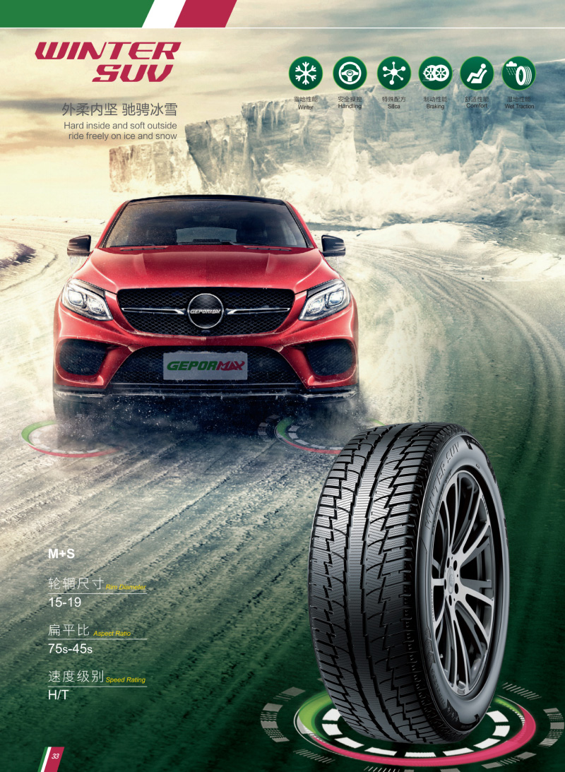 WINTER SUV 創(chuàng)新雙重胎面設(shè)計,有效防止輪胎在冰雪地面上側(cè)滑,提供最優(yōu)化的輪胎接地面積和抓地溝槽、抓地力更強。