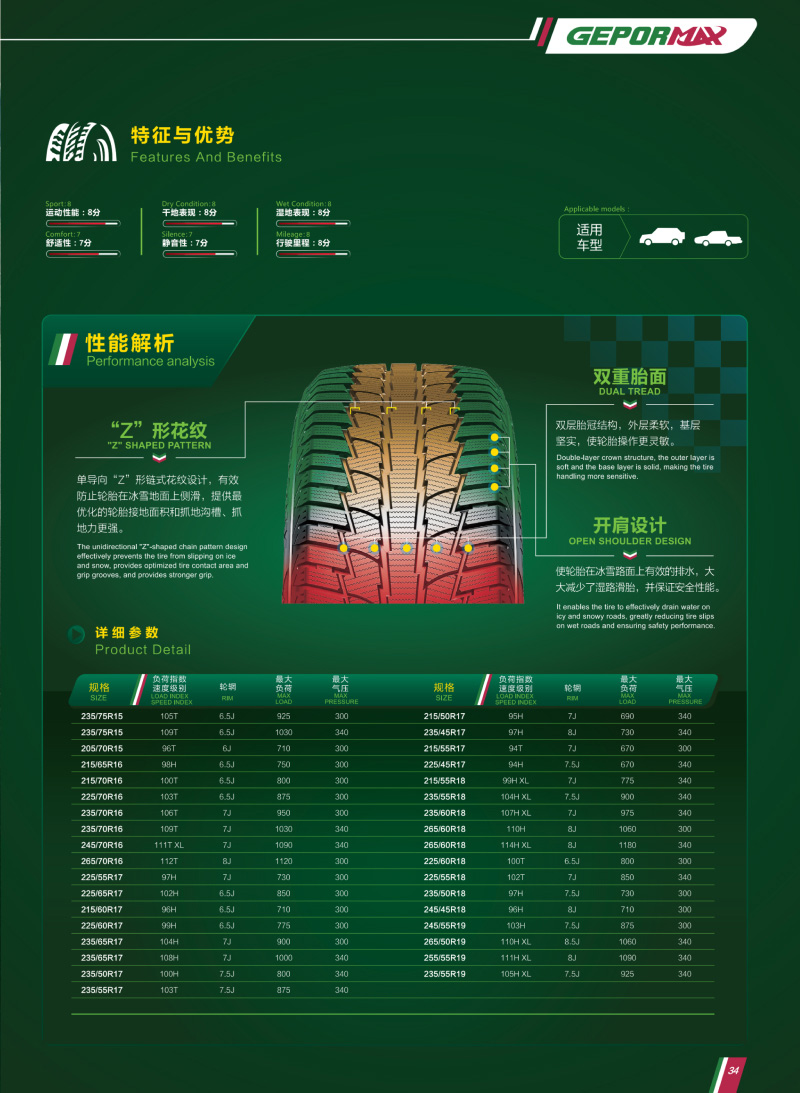 創(chuàng)新雙重胎面設(shè)計,有效防止輪胎在冰雪地面上側(cè)滑,提供最優(yōu)化的輪胎接地面積和抓地溝槽、抓地力更強。